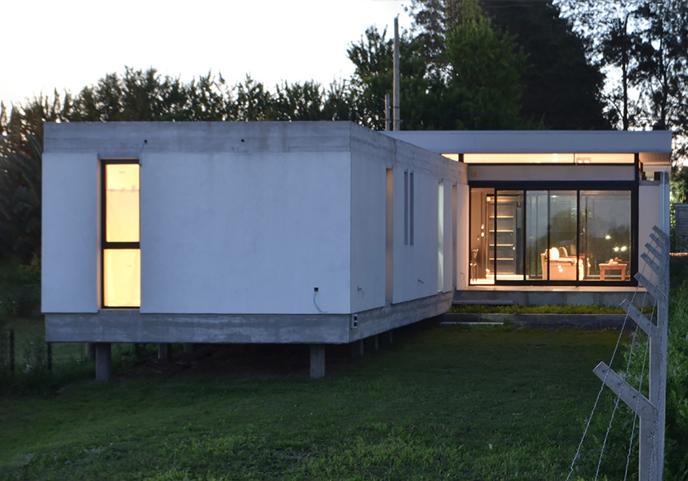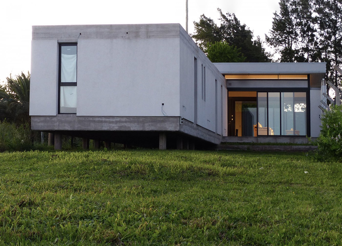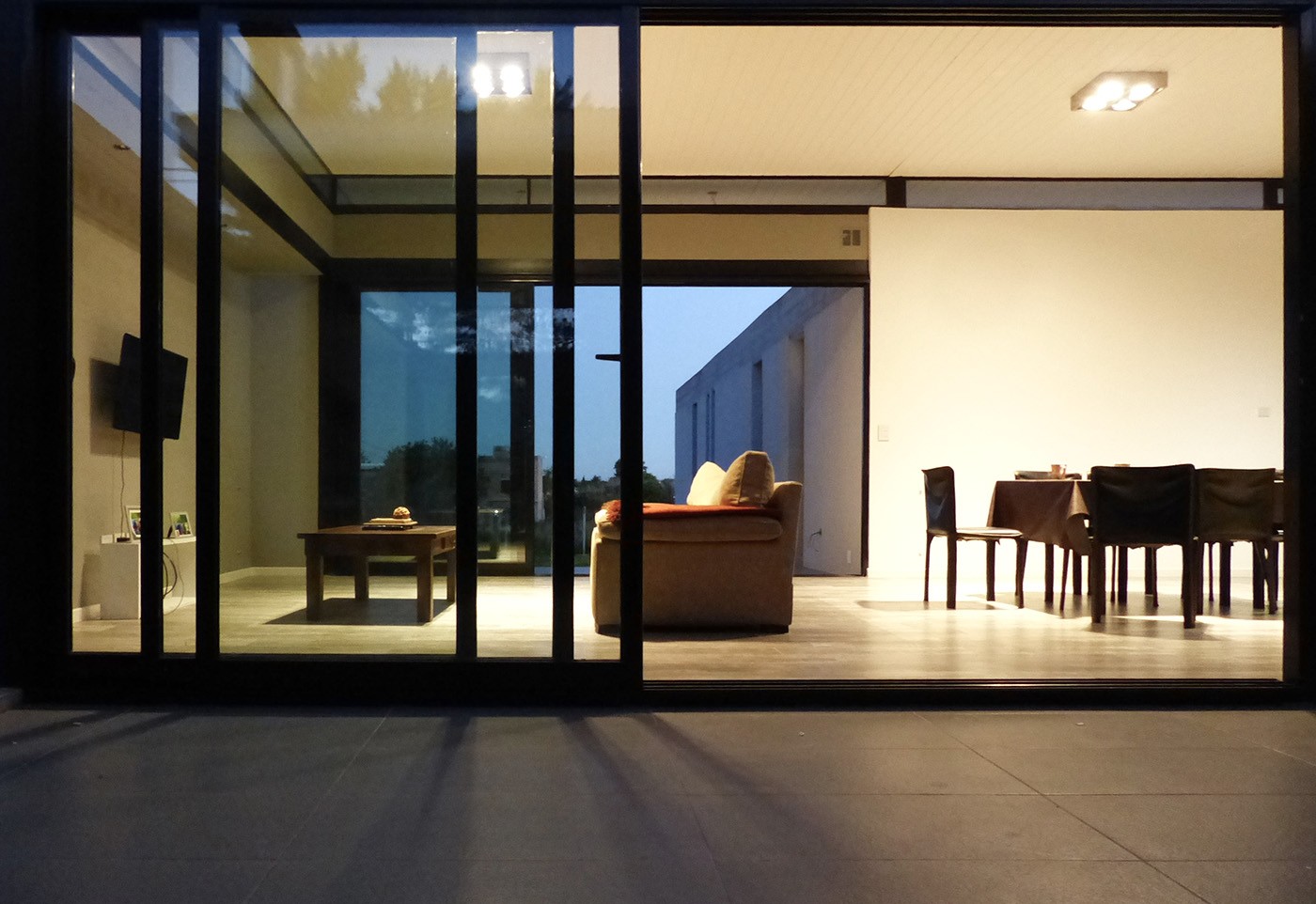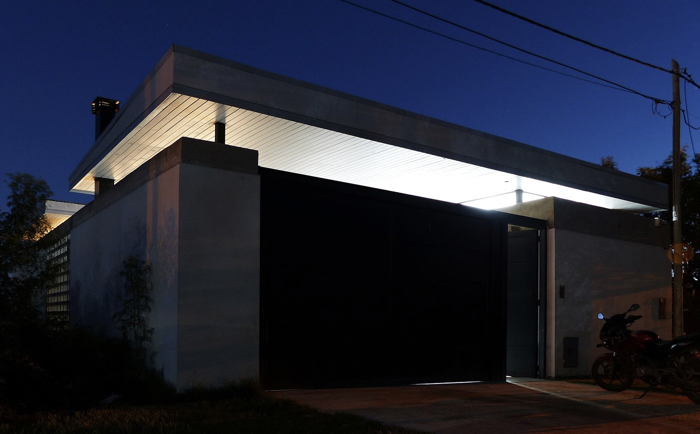 “vivir y trabajar”. La orientación del lote, el desnivel y su proporción son tres características que tomamos como datos para construir la propuesta de la vivienda que se estructura en una secuencia de llenos y vacíos que se disponen en la dirección longitudinal del lote. El desarrollo programático frente-fondo en una sola planta se organiza en un único volumen longitudinal de lectura clara que va desde lo público (acceso y trabajo) a lo privado (dormitorios) con los espacios sociales transversales que ocupan el ancho de lote y se expresan en la lectura volumétrica y su materialidad. Las conexiones y separaciones de los espacios se plantean sin un límite preciso. La propuesta conecta, unifica y a la misma vez independiza y separa las funciones.