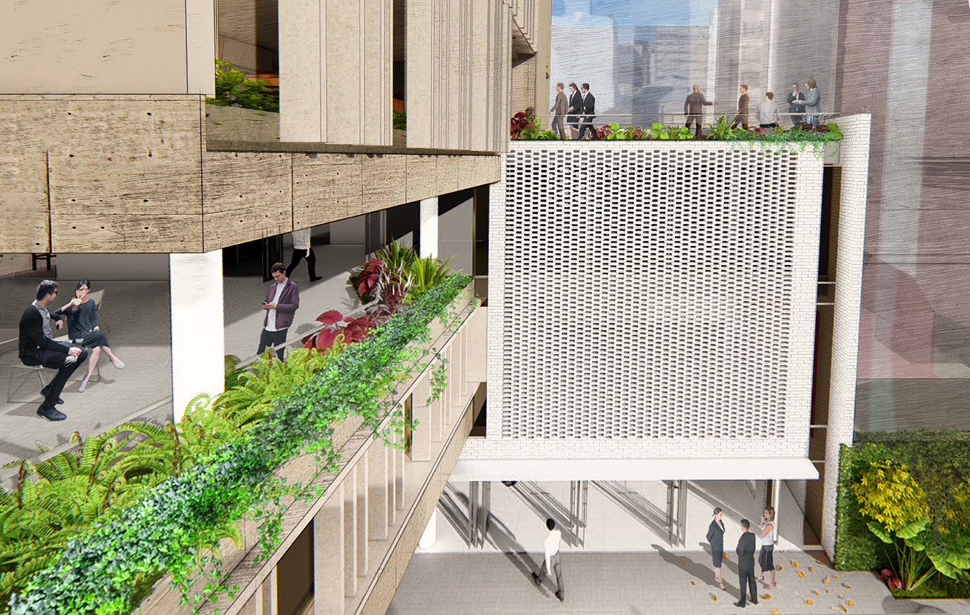 Nuestra expresa un volumen vivo de talleres suspendido sobre un patio urbano de comunion de los arquitectos con la sociedad.