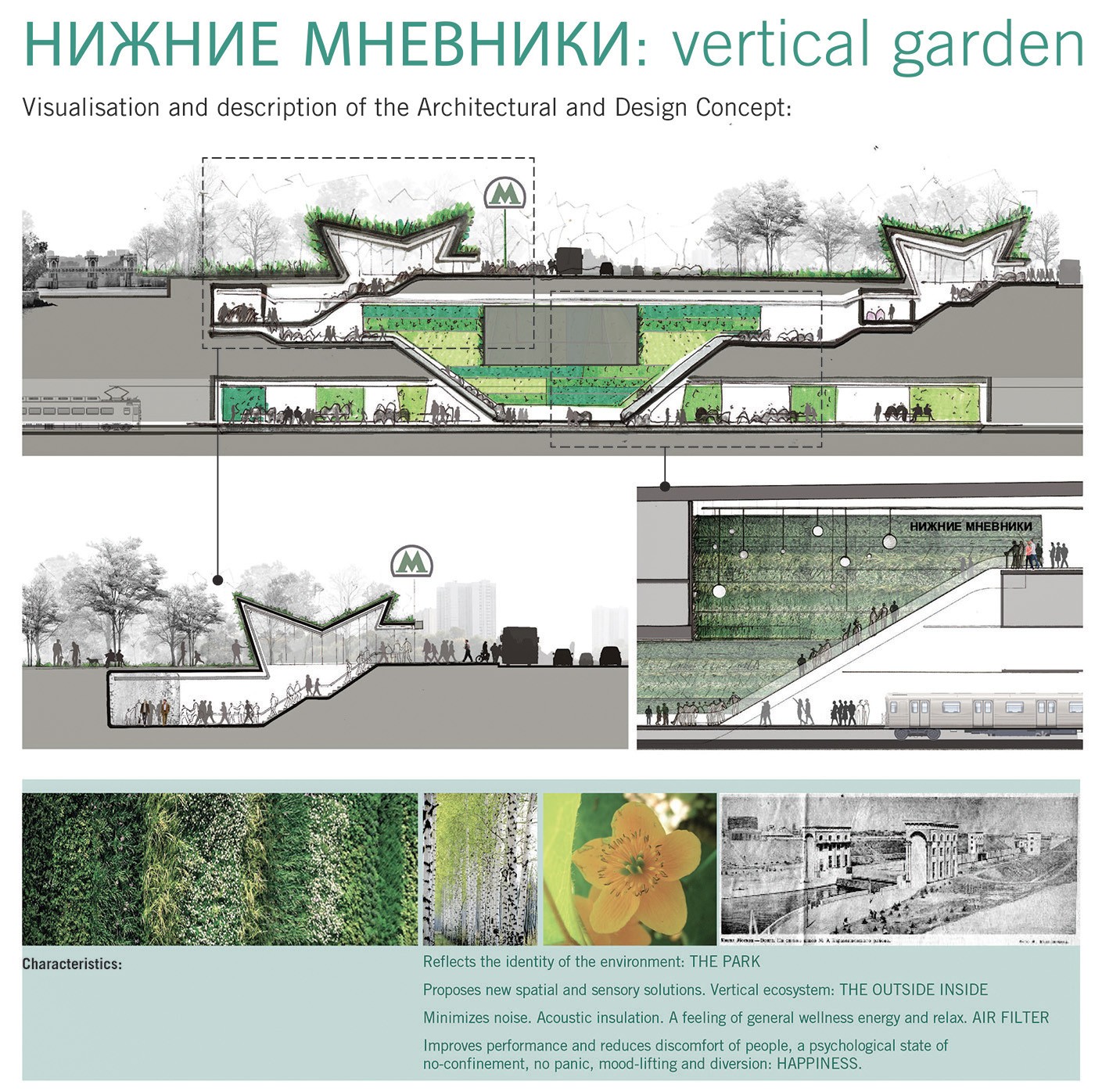 Following the tradition of the Moscow Metro to combine tradition and style, we suggest an underground architecture that is characterized by the recreation of a garden's live nature with its changing seasons and the consequent change of sensations.