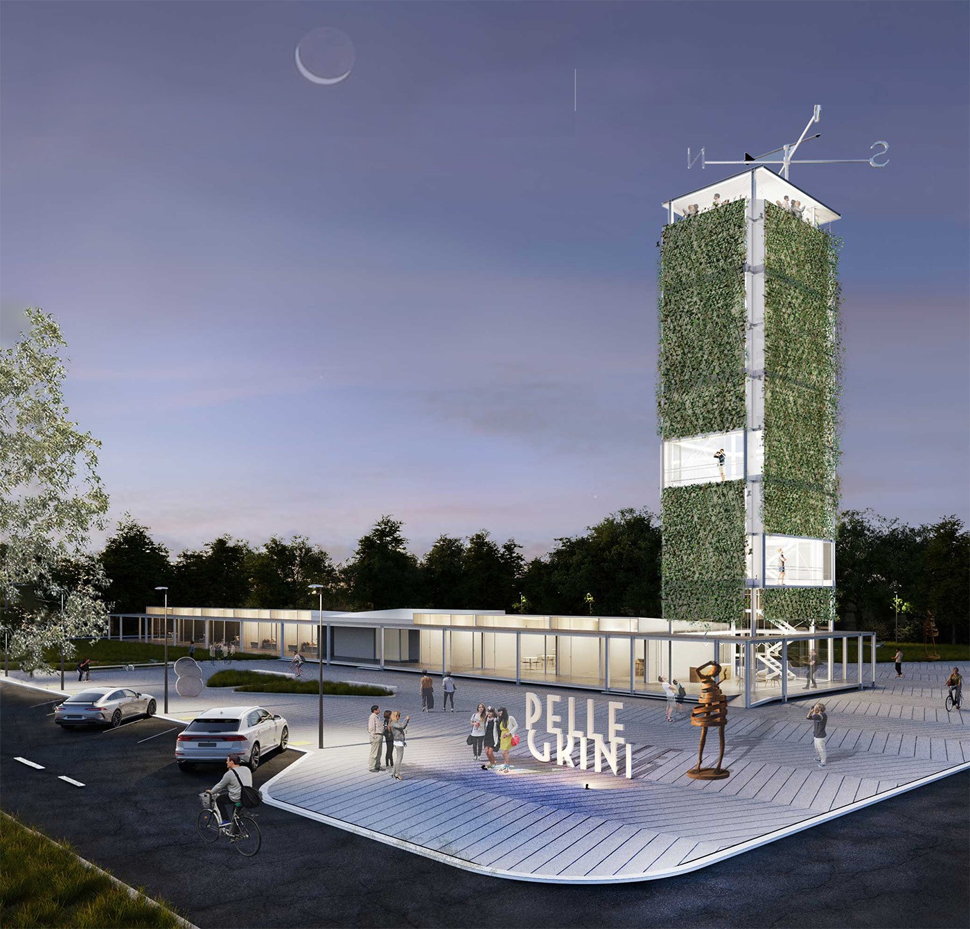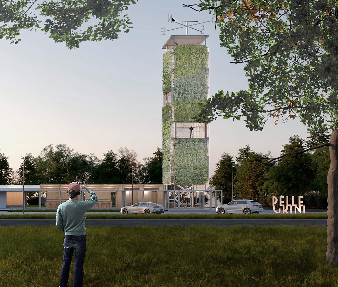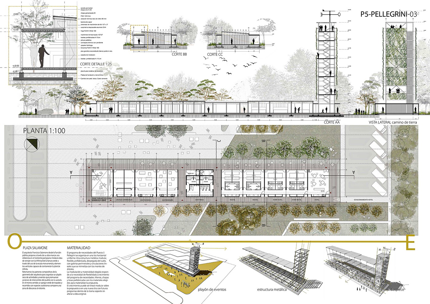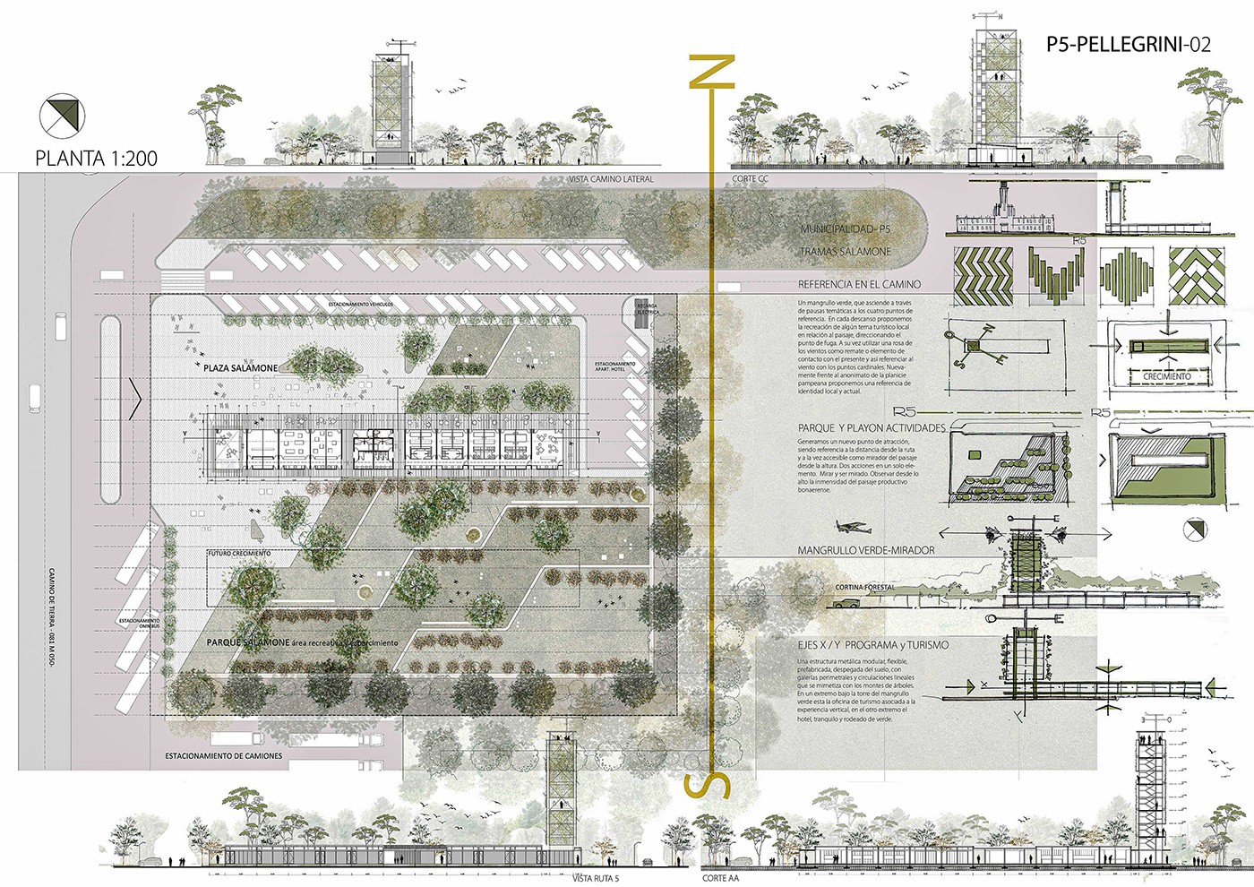 Un mangrullo verde asciende frente al anonimato de la planicie pampeana como referencia en el camino. El programa se organiza en una tira horizontal uniforme, una estructura metálica modular, flexible, prefabricada, despegada del suelo, con galerías perimetrales y circulaciones lineales que se mimetiza con los montes de árboles. En un extremo bajo de la torre verde está la oficina de turismo asociada a la experiencia vertical, en el extremo opuesto el apart-hotel tranquilo y en dialogo con el verde. En el medio de la tira los servicios comunes de sanitarios y cajeros separa los comercios y zonas gastronómicas que expanden en el playón seco "Salamone". La modulación y materialidad es flexibilidad y se adapta al crecimiento del cambiante programa de necesidades.