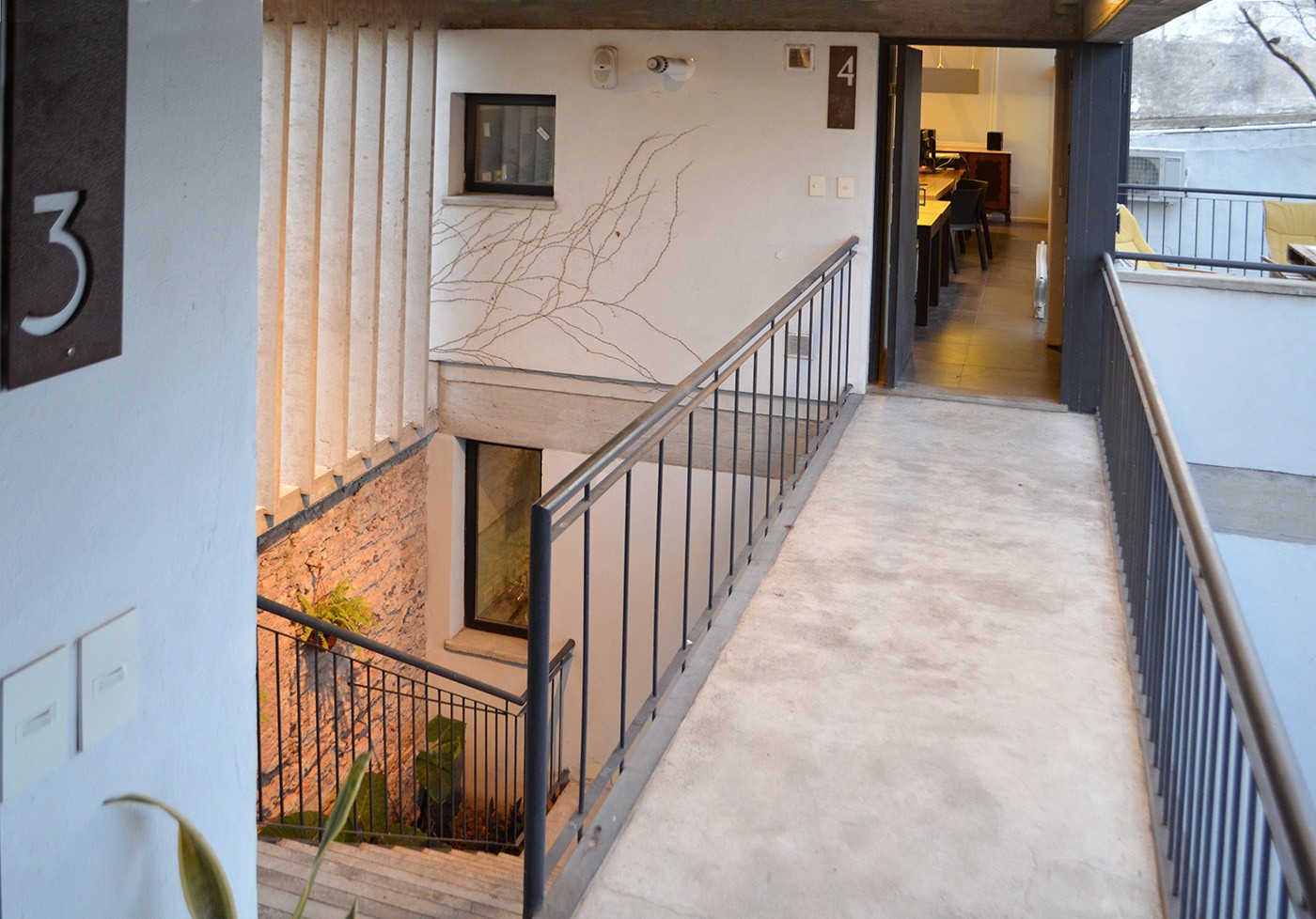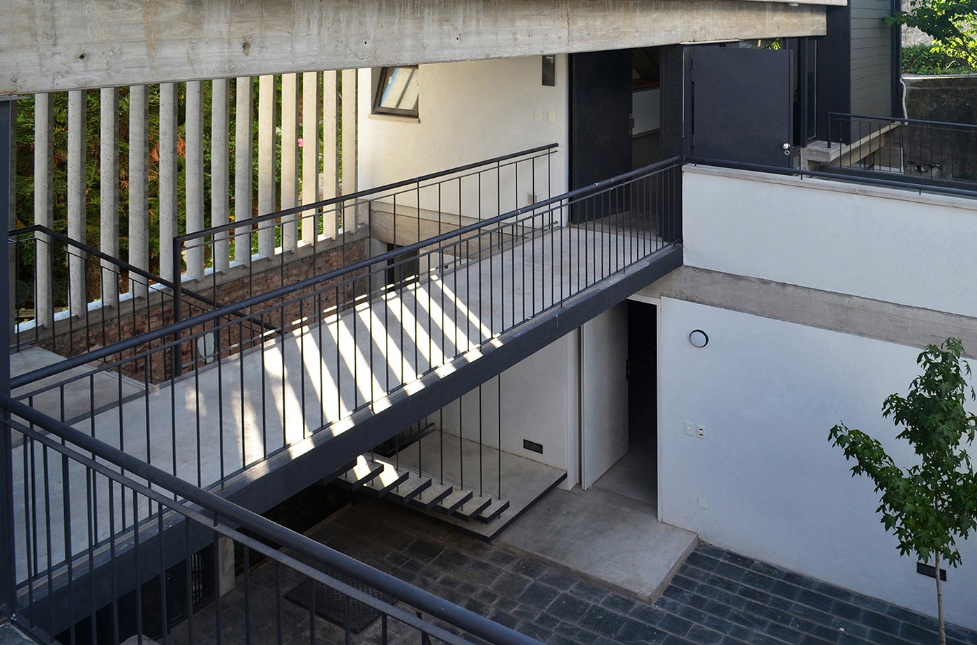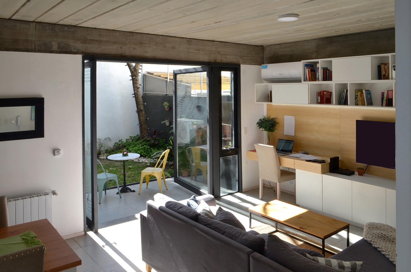 Cada vivienda contiene un patio exterior privado bien orientado y coincidente con el espacio común.La tipología en tira se abre a la cara noreste en una sucesión de llenos y vacíos que se desarrolla en 2 Viviendas de 50 m2 en PB y 2 viviendas de 70 m2 en dos niveles en PA. La materialidad resulta entonces de la convivencia del hormigón armado y el cerramiento industrial diseñando aperturas de vanos con suficiente contención visual para evitar la exposición de los espacios privados al común del conjunto.