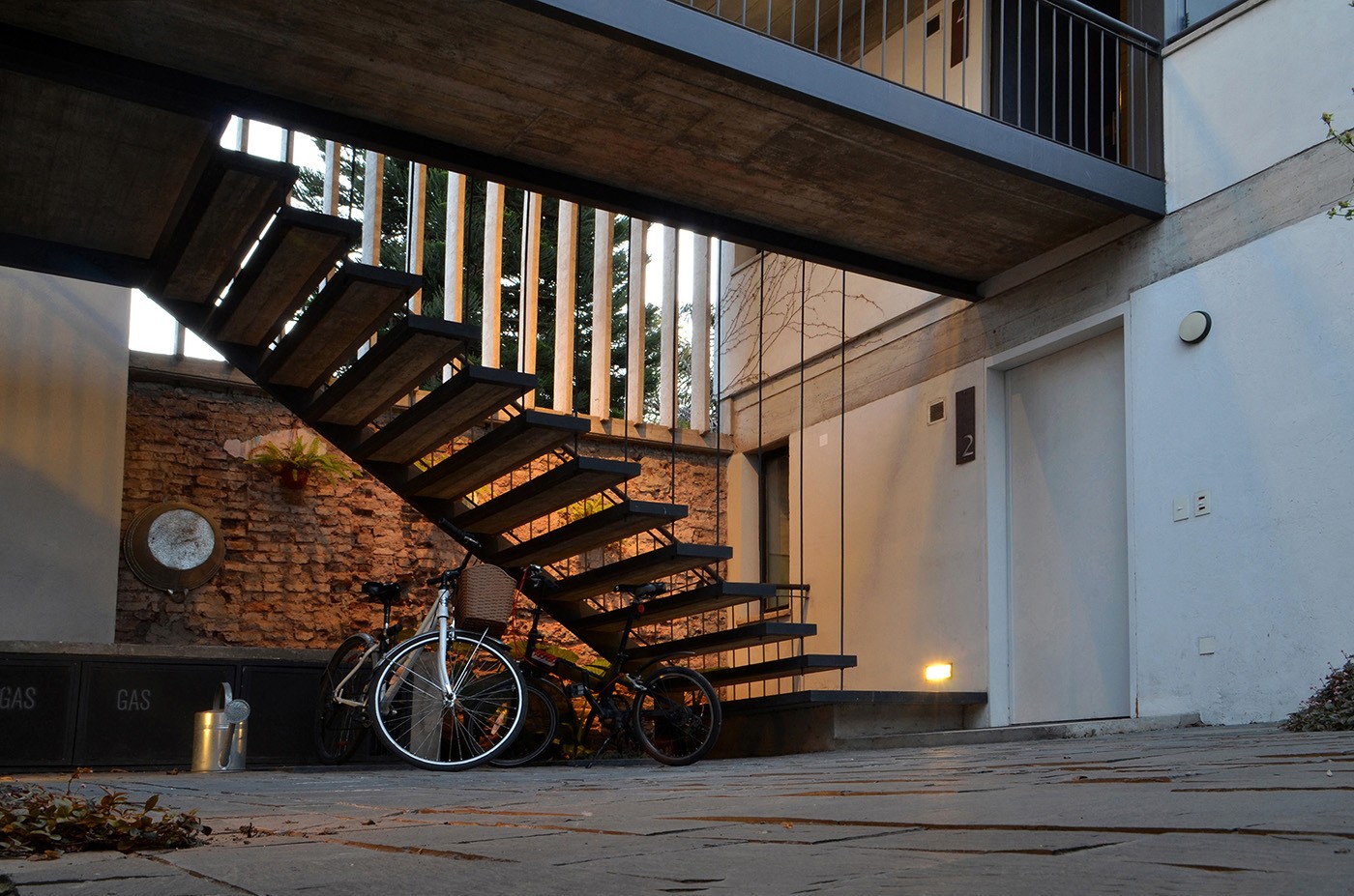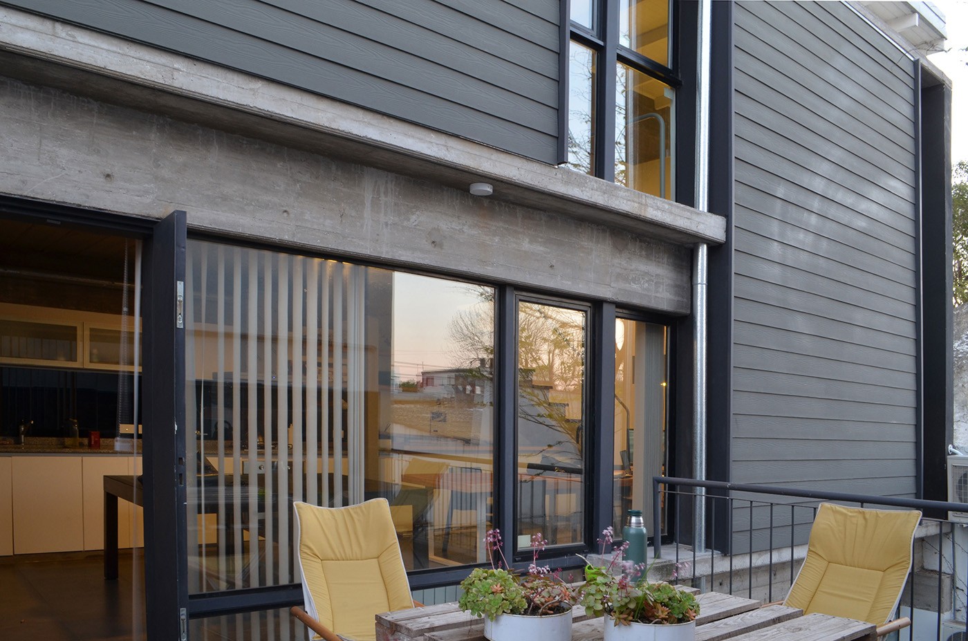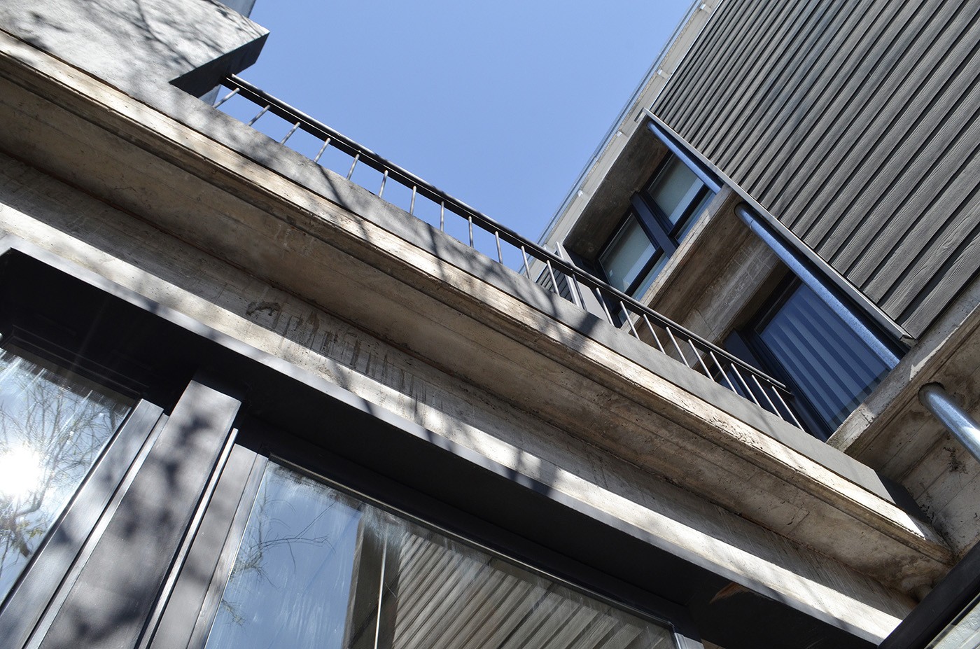 Cada vivienda contiene un patio exterior privado bien orientado y coincidente con el espacio común.La tipología en tira se abre a la cara noreste en una sucesión de llenos y vacíos que se desarrolla en 2 Viviendas de 50 m2 en PB y 2 viviendas de 70 m2 en dos niveles en PA. La materialidad resulta entonces de la convivencia del hormigón armado y el cerramiento industrial diseñando aperturas de vanos con suficiente contención visual para evitar la exposición de los espacios privados al común del conjunto.