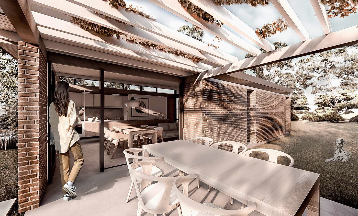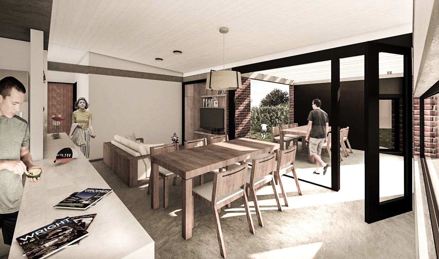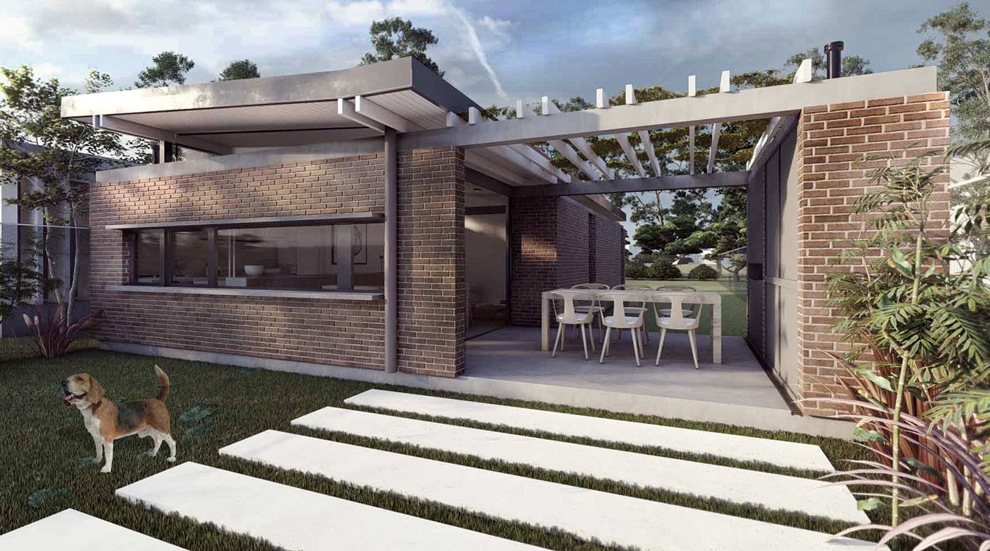 Esta caja de ladrillo típica de nuestra cultura pampeana incorpora una ventilación cruzada e iluminación superior sobre la losa y bajo la cubierta de chapa. La materialidad sencilla, económica y disponible en cualquier municipio facilita los tiempos de obra.