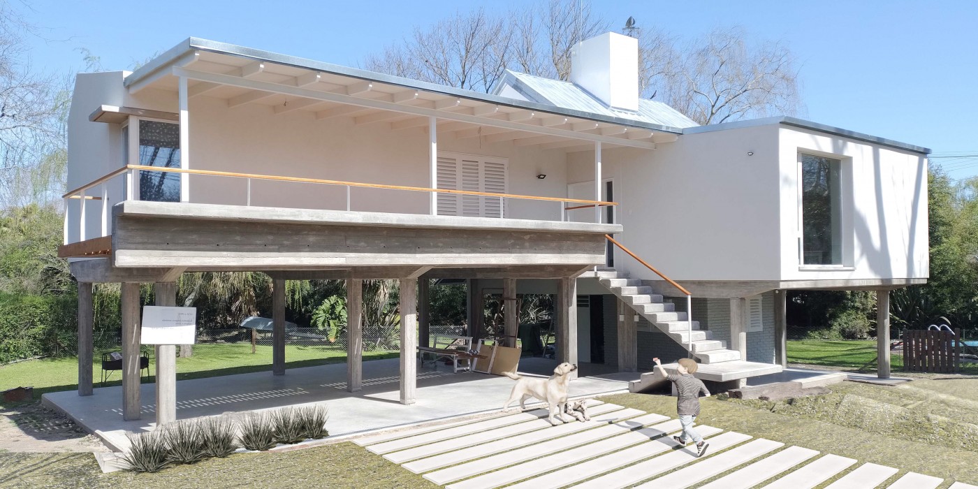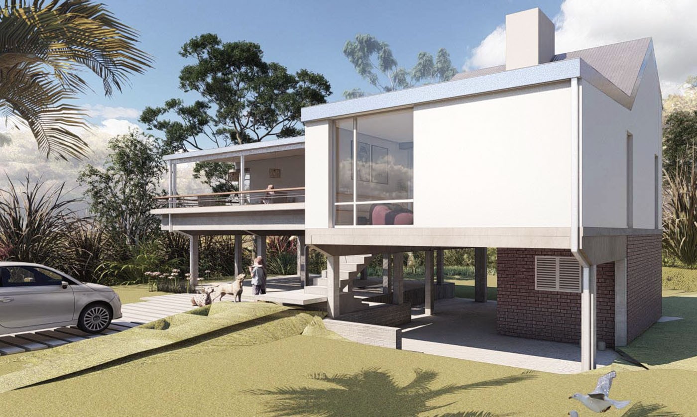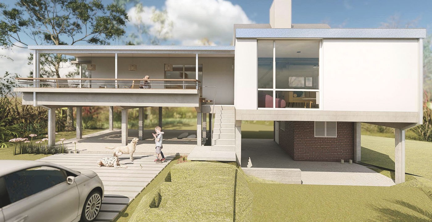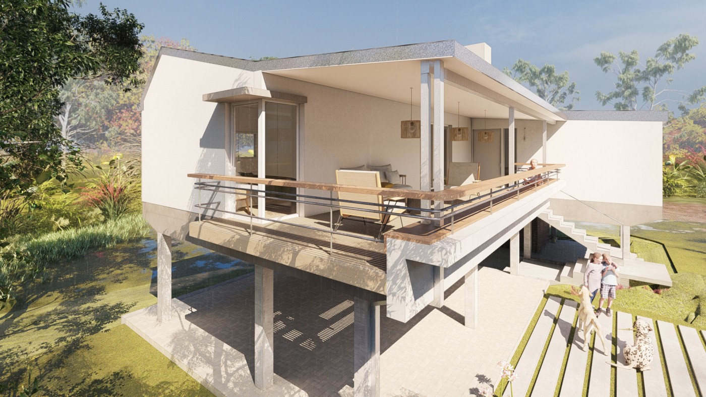 La ampliación se materializa sobre dos laterales del cubo originario. Se genera un nivel de cochera diferente a +2.80 de cota que minimice los efectos de las crecientes, sobre este semicubierto se propone una amplia galería exterior que le da contención a las visuales y rearma una cubierta al parque circundante.